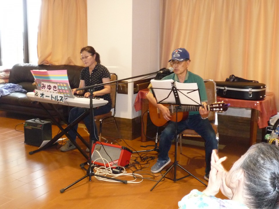 ご利用者の皆様も、用意した歌詞を見ながら、演奏に合わせて歌を唄われていました。