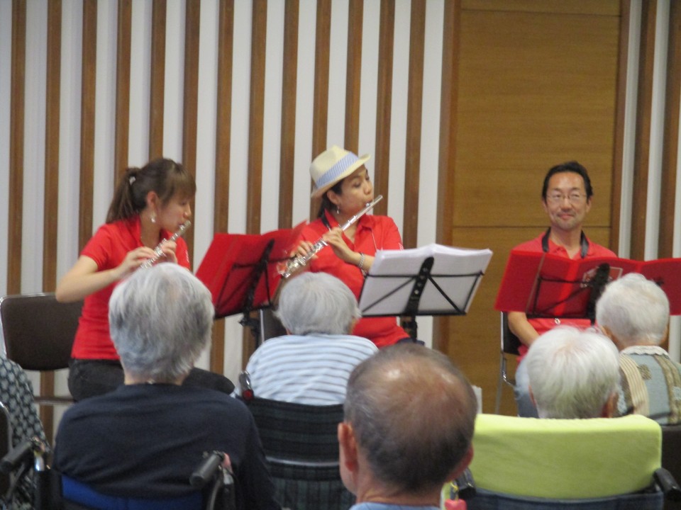 7月22日(金)の14:00より、フルート・サックス奏者のmiwako様、フルート奏者の諸星千春様、テナーサックス奏者の多田和幸様をお招きしまして、ひろやす荘玄関ホールにてjazzコンサートを開催致しました。