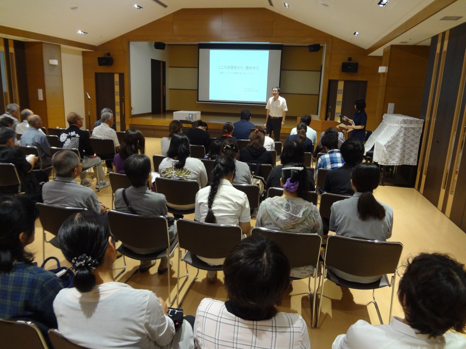 地域の方々も多数参加され、参加者の皆さんで笑顔の練習を行いました。皆さん熱心に聞かれ、笑顔の表情作りに取り組まれていました。