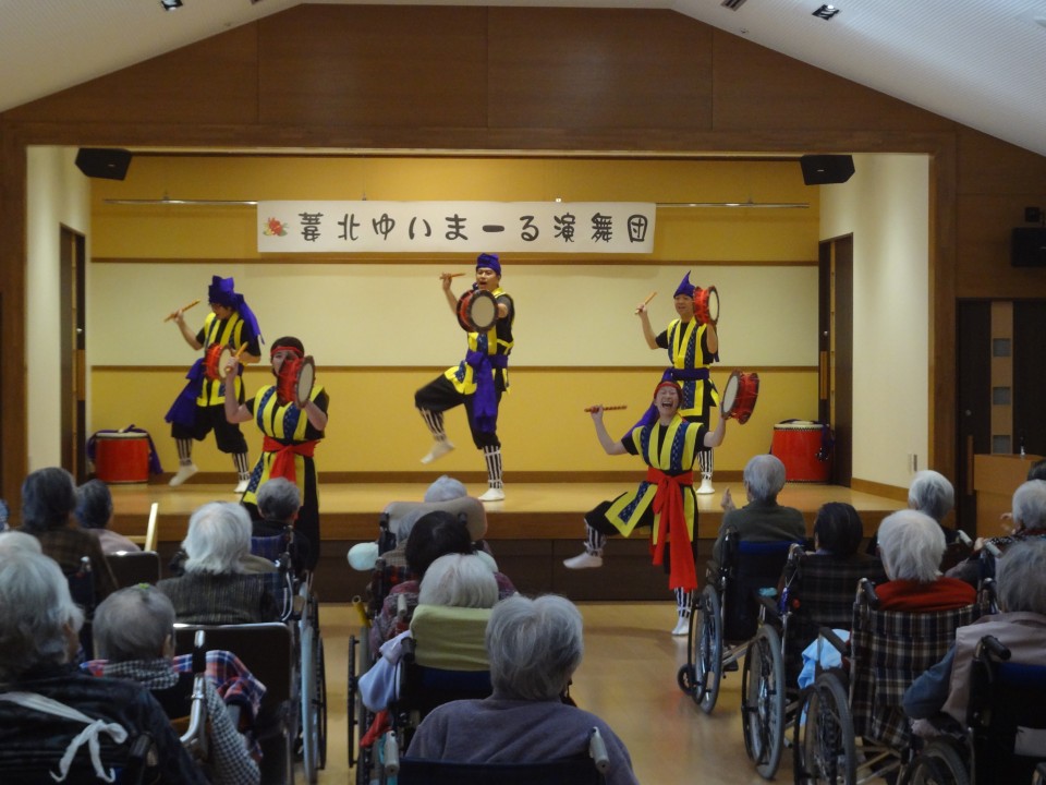 今日ははるばる芦北から、特別養護老人ホーム 田の浦荘の職員さんで結成された『葦北ゆいまーる演舞団』の方々が来荘され、沖縄のエイサー踊りを披露してくださいました。