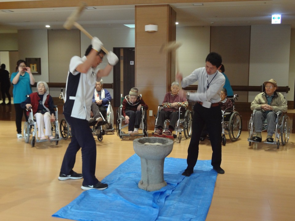 利用者様も一緒に「ぺったん。ぺったん」と杵を持って餅つきを楽しみました。