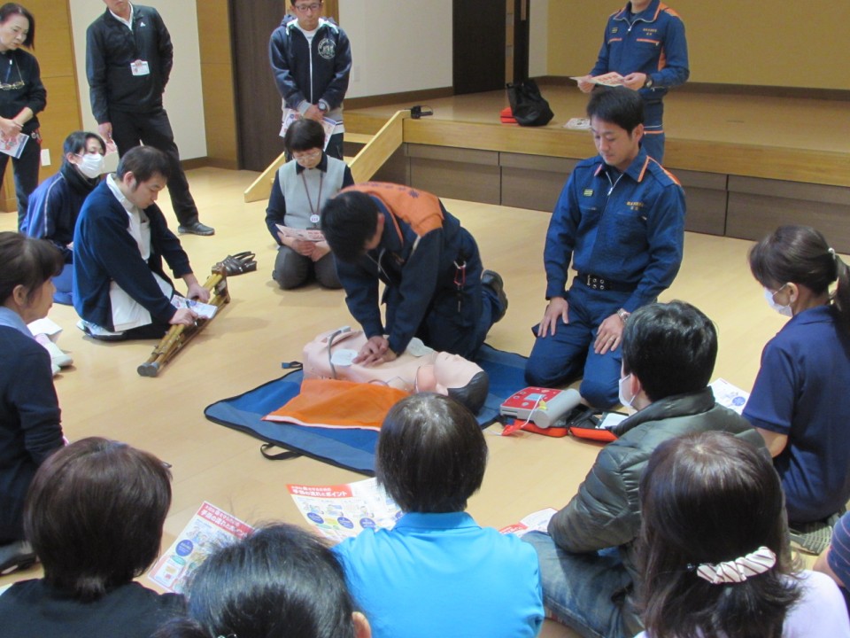 講師として、熊本市消防局益城西原消防署員に、「人形を使った心肺蘇生法」「自動体外式除細動器(AED)の取り扱い」「誤嚥下時緊急蘇生法」について、全職員に講義、指導をしていただきました。