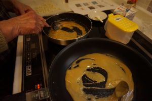 その間に生クリーム・バター・砂糖を煮詰めてキャラメルを作り、パンを入れたら素早く混ぜます