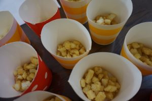 出来上がったキャラメルラスクを紙コップに均等に分けます