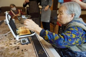 今月はバレンタインデーにちなんで、チョコをかけたワッフル作りを行いました(*^_^*)