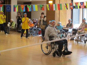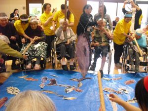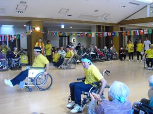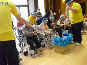 まずは、車椅子リレーから始まり、続いて輪投げ、玉入れ、魚釣り、職員による車椅子競争やパン食い競争と盛り沢山でした。
