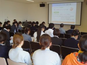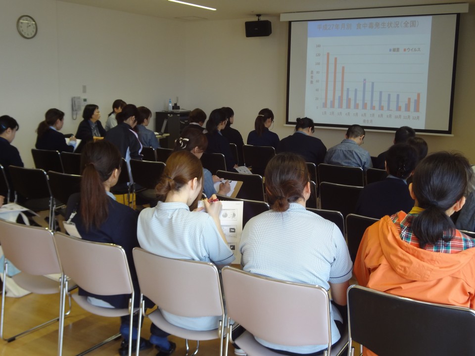 様々な食中毒菌の特徴や注意点について、具体例を交えながらの内容でしたが、普段の何気ない行動に潜む危険性の話や、ひろやす荘での感染体験等の話もあり、重みのある言葉に気が引き締まる思いでした。