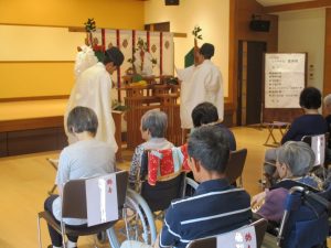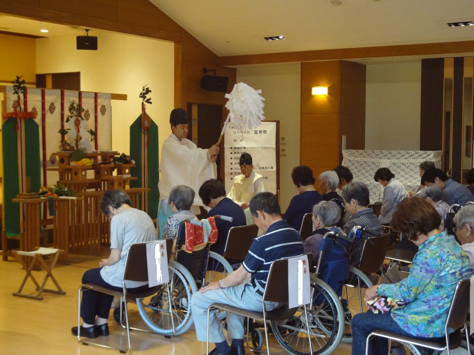 今年は31名の方が賀寿をお迎えになり、当日は26名のご利用者様と約40名のご家族様が出席され、木山神宮の矢田宮司様より御祓いやお祝いの言葉を受けられました。神事の前後にはご家族様との記念撮影も行われ、にっこりと笑顔で写られる方やお澄まし顔で写られる方などご利用者様の様々な表情が見られました。