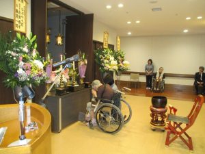 まずはじめにご利用者様を代表し2名の方に祭壇へ献灯・献花を行っていただき、社会福祉法人 慈光会理事長よりお亡くなりになった方々へ追悼の言葉を捧げました。