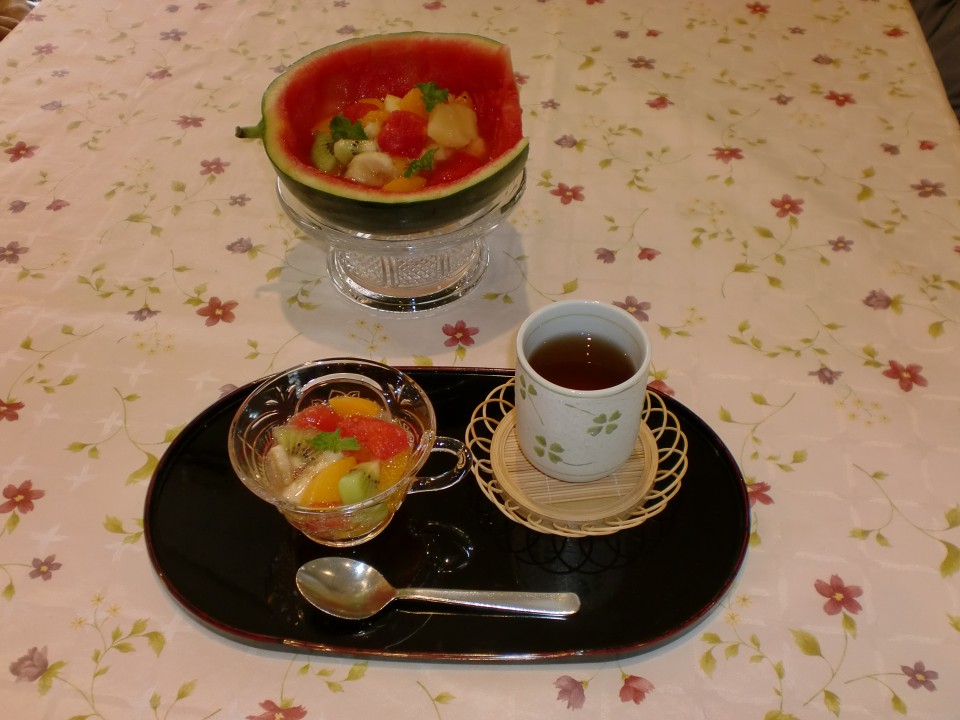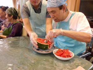 季節のフルーツを切って、スイカを丸くくり抜いて・・・みなさん笑顔で手際よく作業していかれます。