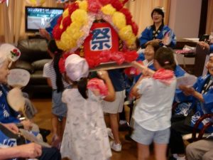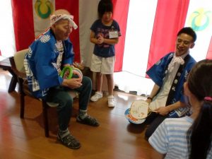 今日は待ちに待ったデイサービス「ココカラいっぽ」の夏祭りです!!前日から紅白幕に提灯と、ホール内の飾り付けを行い準備はバッチリ。まずは、子供みこしから始まります。