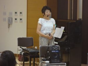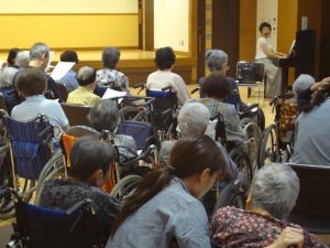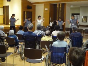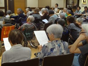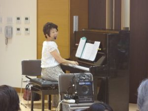 「365歩のマーチ」や「牧場の朝」、「ふるさと」、「川の流れのように」などご利用者様になじみのある曲を中心に、ピアノを演奏されながら美しい歌声を披露してくださいました。