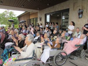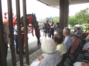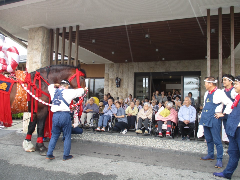 ご利用者様も飾り馬の迫力に少しびっくりしておられましたが、昔からの耳馴染みのあるリズムと「ドーカイドーカイ」のお囃子に、手拍子で楽しんでおられました♪