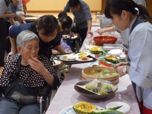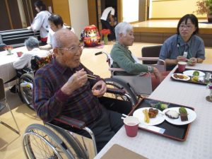 テーブルに並べられたたくさんの料理を前に、「どれにしようかな」「あれもおいしそうねぇ」と迷われながらも、思い思いに選ばれて席に着き、皆さんで談笑しながら召し上がられました。