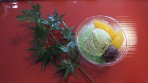 まずはおやつのかき氷作り!氷を削ってイチゴ味やメロン味の蜜をかけ、アイスクリームと餡子、フルーツをお好みでトッピングして完成です。