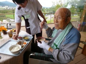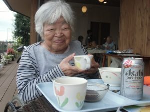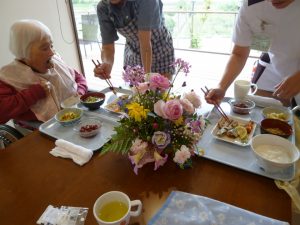 食べる頃には天気が少し回復したので、希望されたご利用者様にはベランダで召し上がって頂きました。それほど寒くなく、「気持ちがいいね」と仰り、食事もすすんだご様子でした。