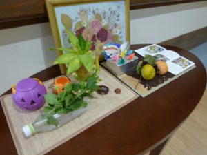 多床室(かめ・つるユニット)で、”秋楽彩”と題して、秋の季節を感じて頂ける催しを開催しました。当日は天候に恵まれず、室内での開催となってしまいましたが、少しでも秋を感じていただけるように、部屋の中を季節の物で飾り付けました。
