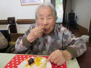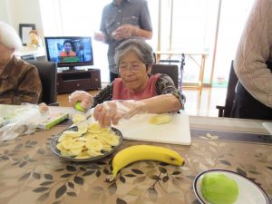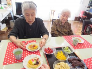 焼いている間に、ご利用者様にも手伝っていただいて、ホットケーキに盛り付けるフルーツ(イチゴ・バナナ・キウイ・サクランボ・桃)をカットします。みなさん手際よく作業され、あっという間に切り終わりました。