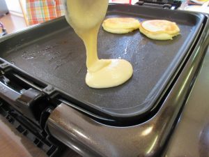 まずは、生地作りから。材料をよく混ぜ合わせて、ホットプレートで焼いていきます。焼き始めると、部屋中にあま~い良い香りが漂います♪