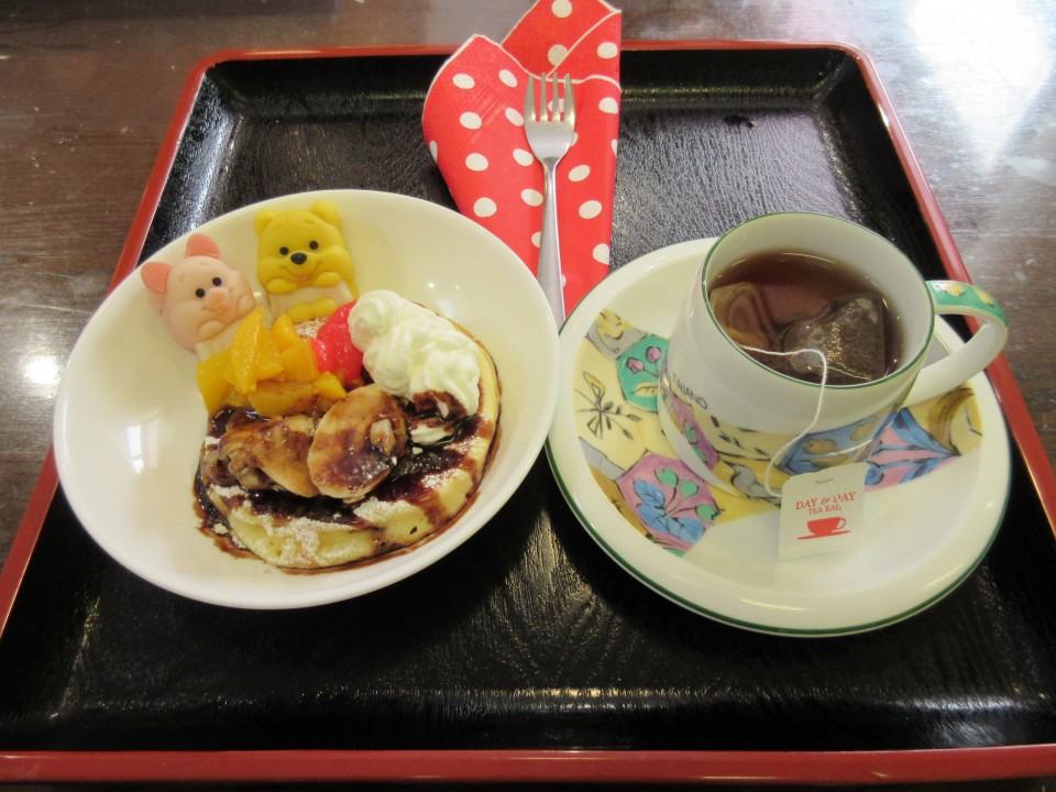 最後に盛り付けです。お手本を参考にしながら、焼き上がったホットケーキの上にお好きなフルーツを選んで盛り付けていただきました♪「あ~美味しそう!」「早く食べたいね。」と隣同士でワイワイ大盛り上がり(^^)v