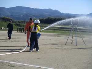 この大会は、益城町及び西原村地区において、企業における自衛消防組織の強化と防火意識の高揚を図るという主旨のもと、火元に見立てた標的に放水し、操作開始から標的が倒れるまでのタイムや操作員の動きの正確さなどを競い合うものです。