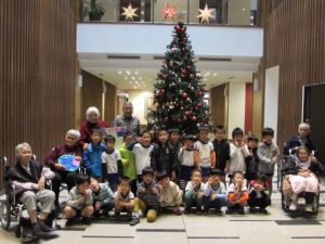 最後に玄関の大きなクリスマスツリーの前でみんなで記念撮影。