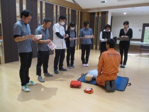 高遊原消防署にご協力いただき、12月7日(木)と12月14日(木)の2日に分けて、心肺蘇生法とAED(自動体外式除細動器)の取り扱いについての内部研修を行いました。