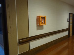 AEDとは、心臓が痙攣し血液を流すポンプ機能を失った状態(心室細動)になった心臓に対して電気ショックを与え、正常なリズムに戻すための医療機器です。 2004年7月より医療従事者ではない一般市民でも使用できるようになり、ひろやす荘内にも2ヶ所設置してあります。
