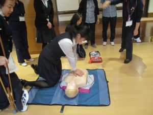 3つのグループに分かれ、練習用の人形を使用し、心臓マッサージと人工呼吸、AEDの操作を練習しました。消防署の方に正しいやり方やコツをご指導いただきながら、参加した職員全員が交代で行います。みんな真剣な表情で、質問をしたりメモを取りつつ研修を受けました。
