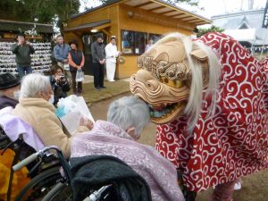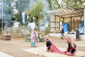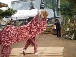 天候にも恵まれ、暖かい日差しの中、地域の方々もたくさん参加されていました。まずは、お払いと獅子舞の奉納があり、迫力のある踊りに皆さん見入っておられ、中には写真を撮っておられる方も。