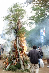 獅子舞の奉納が終わり、いよいよ櫓に火が入ります。燃え上がる炎とともに、時折パーンと竹の破裂音が響き、「おお~」と声を出してびっくりされるも、とても盛り上がりました。