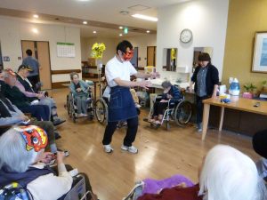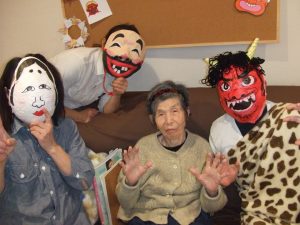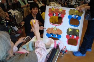 鬼に扮した職員めがけて、「鬼は外!福は内!」と掛け声をかけながら、みんなで一斉に豆を投げて邪気払い!