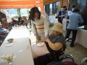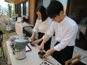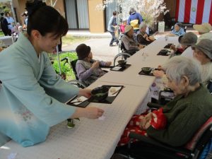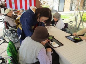 お抹茶も職員が点てました。ご利用者様のお席には、和服美人がお届け♪