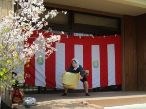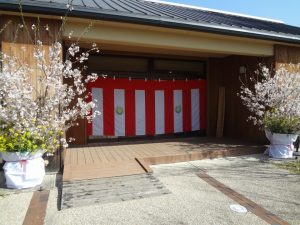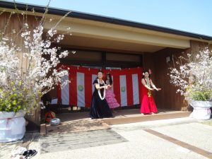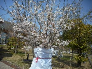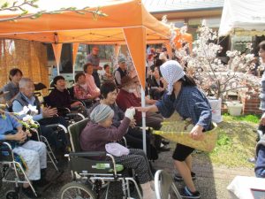 今日は、桜花見会を行いました。ひろやす荘の桜はお花見をするにはまだまだ物足りないので、ケアポートの桜を切り出してきて、中庭に特設会場を設置!