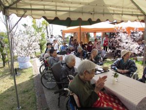 満開の桜と澄んだ青空の下、ご利用者様も職員も楽しめた花見会となりました。