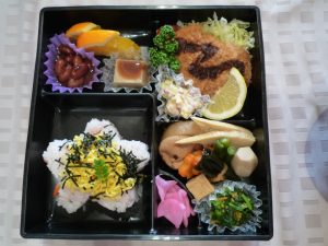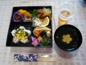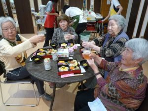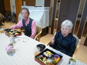 お弁当箱に詰められた色とりどりの豪華な料理に、利用者様から「わ~、すごいご馳走がいっぱい」との声があがり、ノンアルコールビールやジュースなどで乾杯をし、食事を楽しまれました。