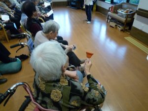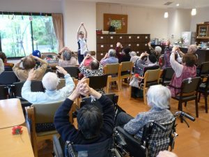 ココカラでは月1回音楽レクリエーションを行い、毎回テーマを決め、そのテーマに沿った音楽を選び歌や体操をしています。