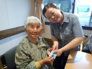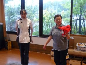 最後に、母の日のプレゼントとして女性のご利用者が創作活動で作られた、ビーズのストラップを皆さんに配りました。