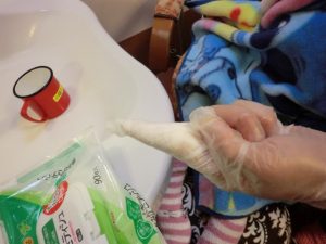 うがいをする際には出来るだけ前かがみになってもらい、ブラッシング後の汚れた水分を間違って飲み込まないようにする事、またブラッシングを行う際にも、あらかじめ指に口腔ケアティッシュを巻きつけておく事でブラシの汚れを小まめに取ったり、ベッド上でうがいが出来ない方も口腔内の水分を拭き取る事ができ、誤嚥予防に繋がるとのことです。