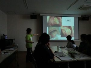 二日目の午後からは、例年は実際の入居者様を対象に、ケアを実施しながら指導して頂いていましたが、お二人のご厚意により毎年新人中堅職員研修の中で行っている『口腔ケア』の時間を利用し、「口腔ケアの基本について、気持ちいい口腔ケアとは、歯ブラシの入れ方の実践」などをわかり易く、実演を交えてご講義頂きました。