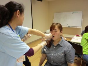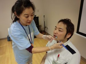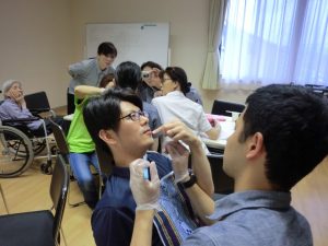 研修は口腔の見方・歯ブラシの持ち方などの基本的な内容から始まり、実際にケアを受ける入居者様の気持ちを知る為に、相互演習として1対1で実際にブラシを使って「ブラシの入れ方・開口のさせ方・磨き方」などわかり易く指導していただきました。