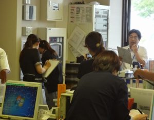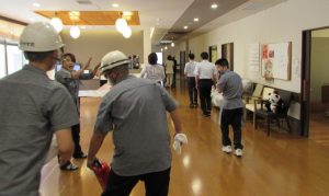 他部署から消火の応援に駆けつけ、お互いに声掛けしながらご利用者様の避難もスムーズに進み、事務室では放送を行い、各居室から避難完了の連絡が入ります。