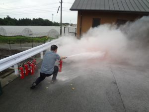 その後、主に新人職員を対象とした消化器消火訓練の為、消化器の仕組みや取り扱い方法、消し方のポイントなどの説明を受け、実際に消化器を使い、火を消す訓練を行いました。