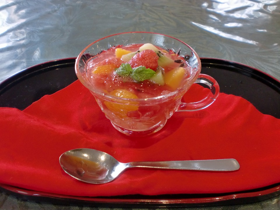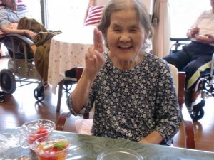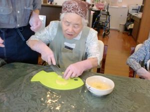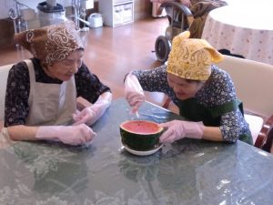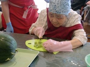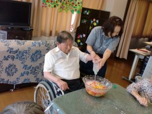 今日は暑さをしのごうと、皆さんと爽やかにフルーツポンチを作りました。