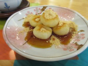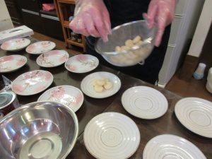 丸めた団子を茹で上げて、お皿に盛り付けていきます。