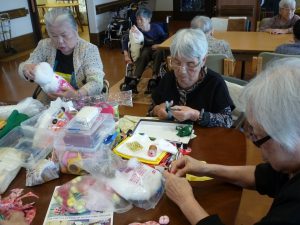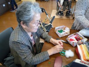 今年も手芸が趣味の利用者様と創作活動サークル「フレンド」のメンバーに協力していただき、全員に配布するクリスマスプレゼントの製作に取り組みはじめました。