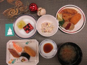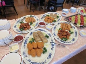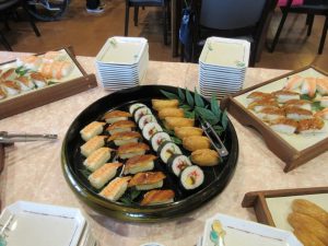 バイキングのメニューは、巻き寿司・稲荷寿司・クリームコロッケ・エビフライ・ミートローフ・プチケーキなどなど。
