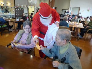 サンタクロースから利用者様にプレゼントを渡すと、「何だろう?」とすぐに袋の中身を確認!