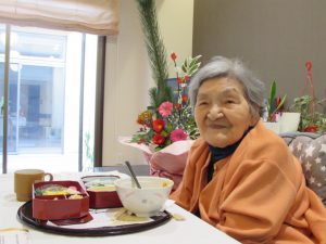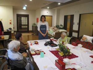 入居者の皆さんにお正月の雰囲気を味わっていただけるように、ご利用者も職員も正装して参加♪