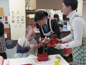 毎年恒例の雑煮会では、入居者の方々が安全に安心してお雑煮やお節料理を食べていただけるように…との思いから、全部署の職員が参加しご利用者の食事介助や見守りを行っています。